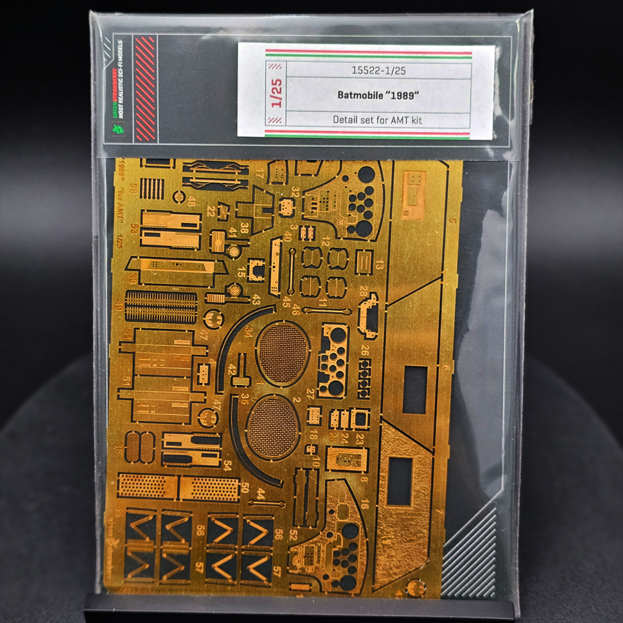 1/25 scale Batmobile (1989) photo-etch (PE) detail set for the AMT kit. A slick upgrade for the classic Keaton-era Batmobile that helps sharpen up fine details for a cleaner, more finished look.