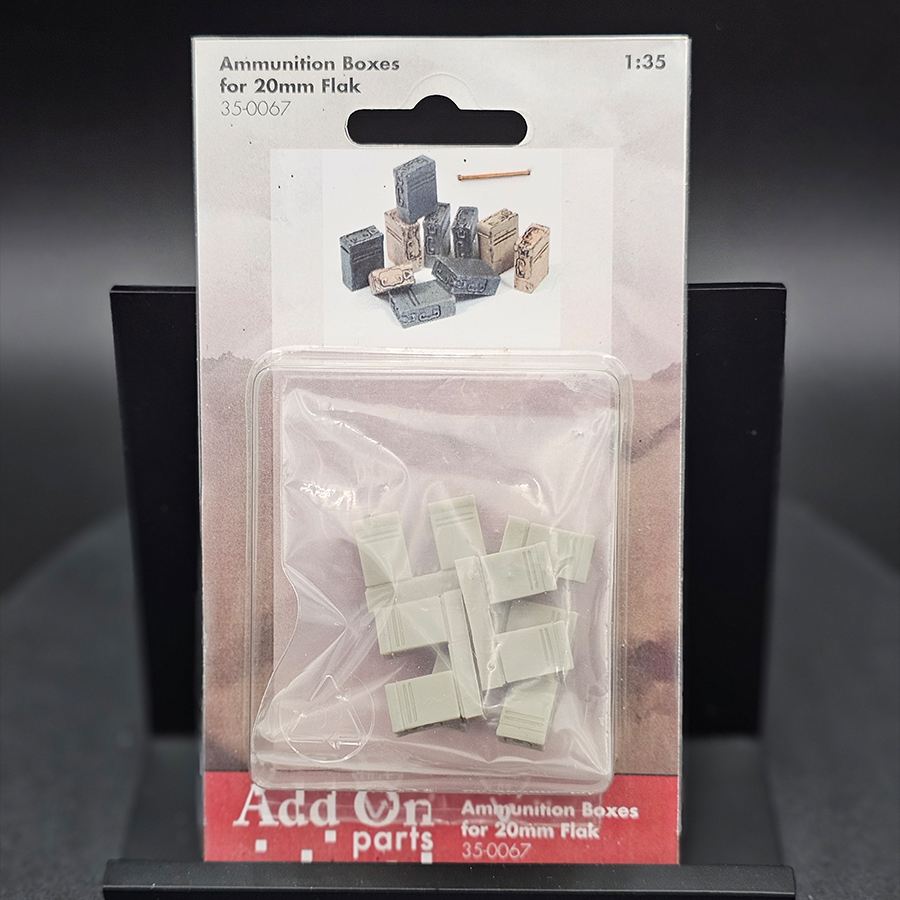 Add On Parts 1/35 scale Ammunition Boxes for 20mm Flak (10 pieces) aftermarket detail set. Perfect for German Flak scenes, ammo dumps, vehicle stowage, and armor dioramas that need extra realism.