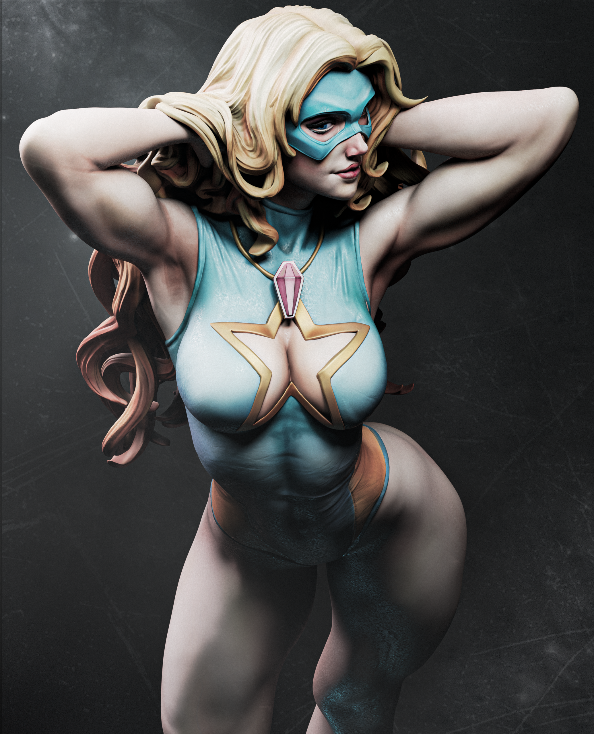 The bust versions focus on Blonde Blaze’s head, upper torso, raised arms, flowing hair, turquoise mask, and the large star chest emblem. The hair falls around the shoulders and back in layered strands, while the lifted pose and facial expression give the bust a strong display presence from multiple angles.