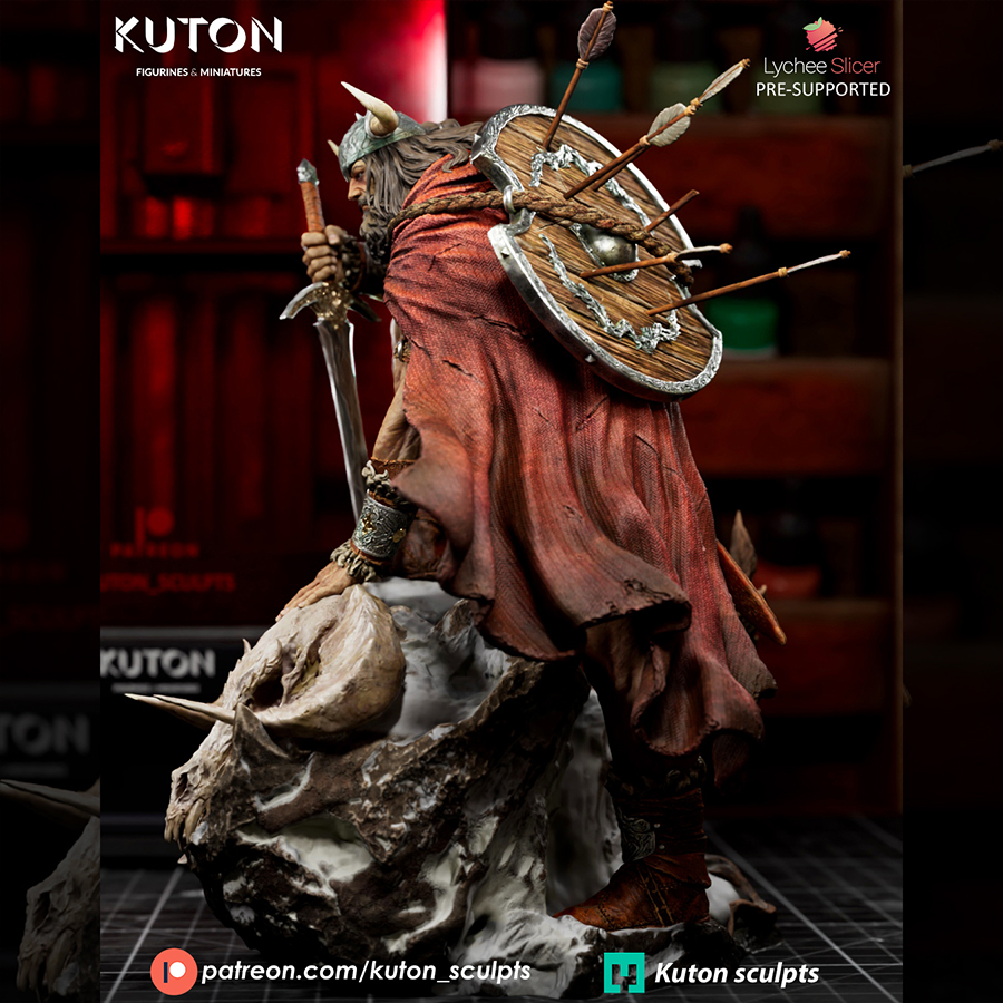 This one is a painter’s playground: fur trims, hammered metal, leather straps, weathered cloth, and that gnarly skull-and-stone base begging for gritty washes and drybrushing. The face and beard have strong forms for highlights, and the helmet/horns give you a perfect spot to push aged steel, bone tones, or subtle verdigris.