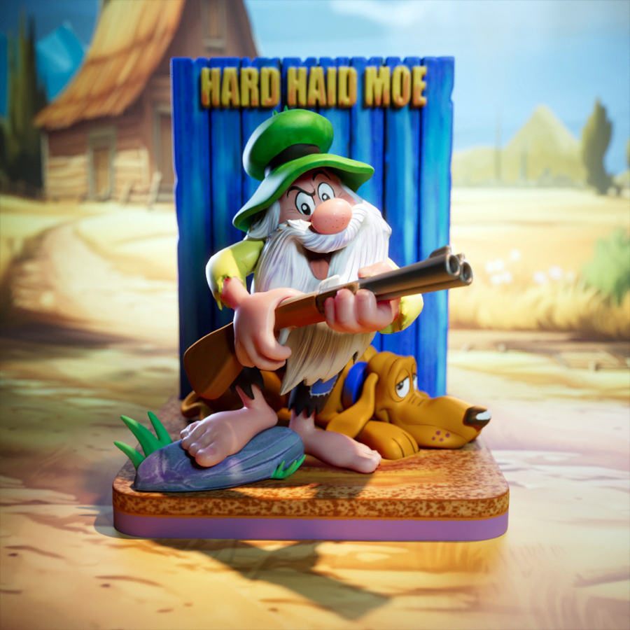 Bring classic backwoods cartoon troublemaker energy to your shelf with Hard Haid Moe—big expressive shapes, clean stylized detail, and a fun “don’t mess with me” pose that’s super satisfying to paint. Between the shotgun, the sleepy hound, and the little scene-base backdrop, this one has a ton of character without being fussy to finish.