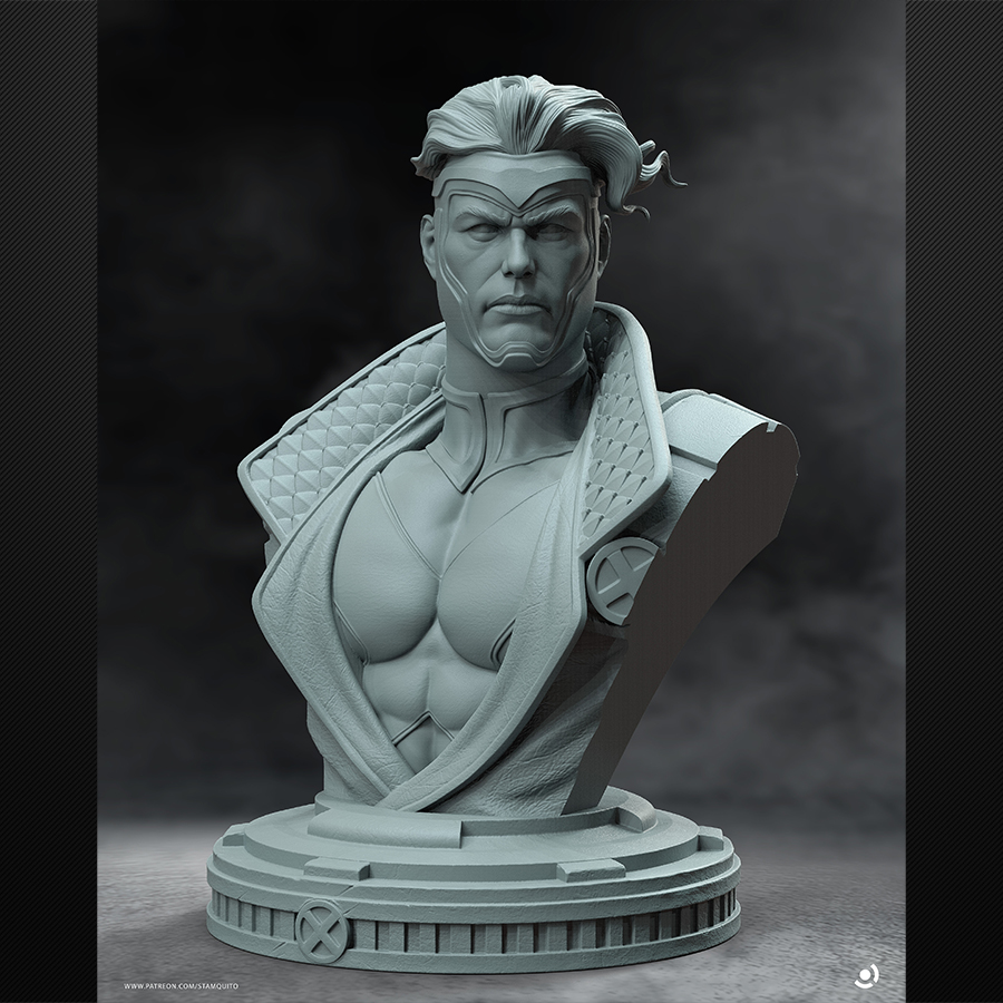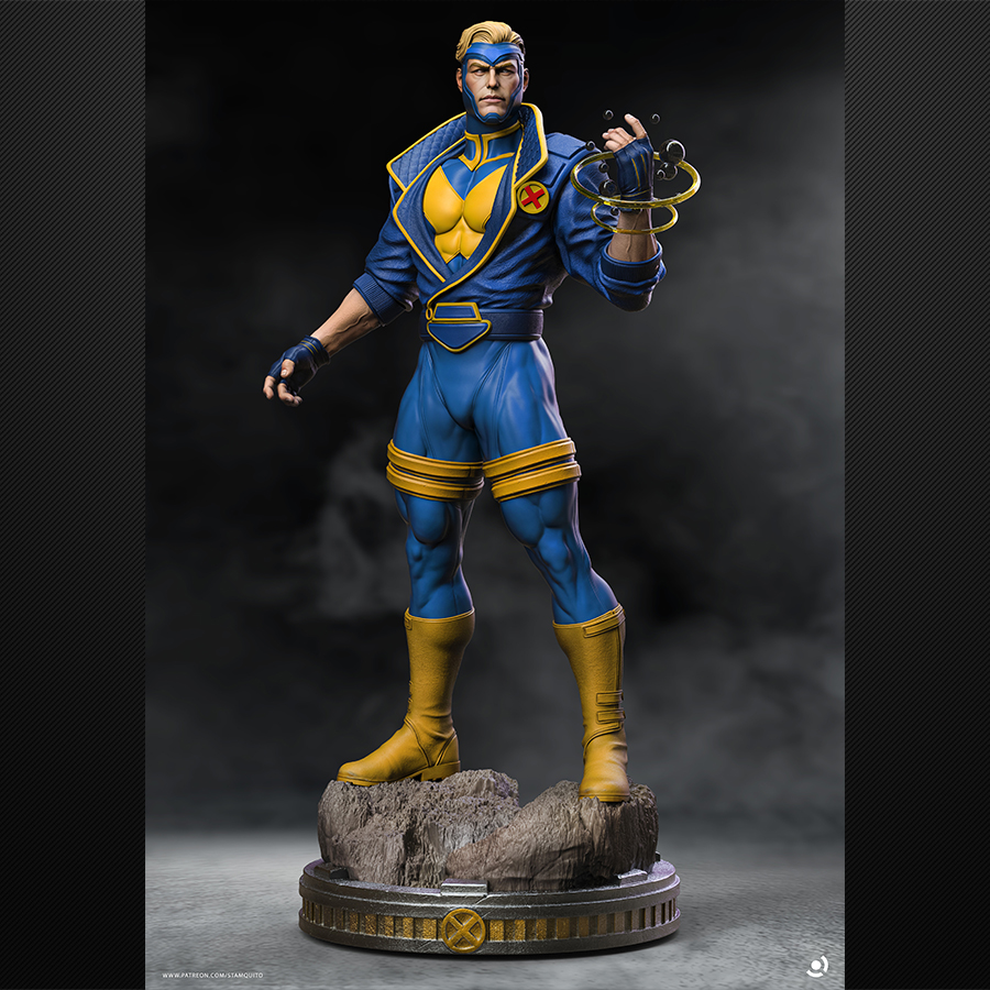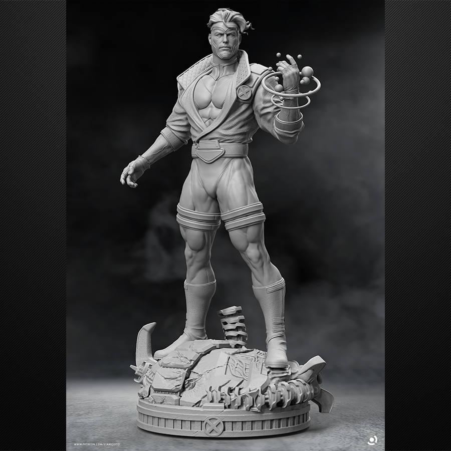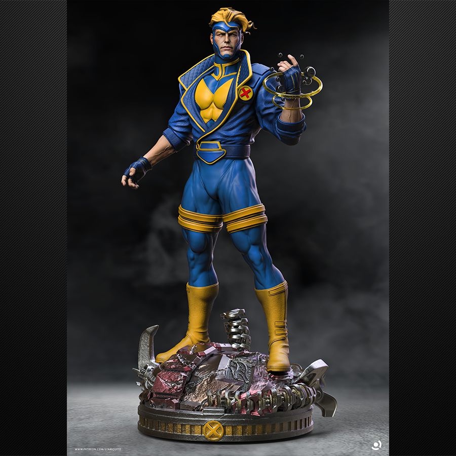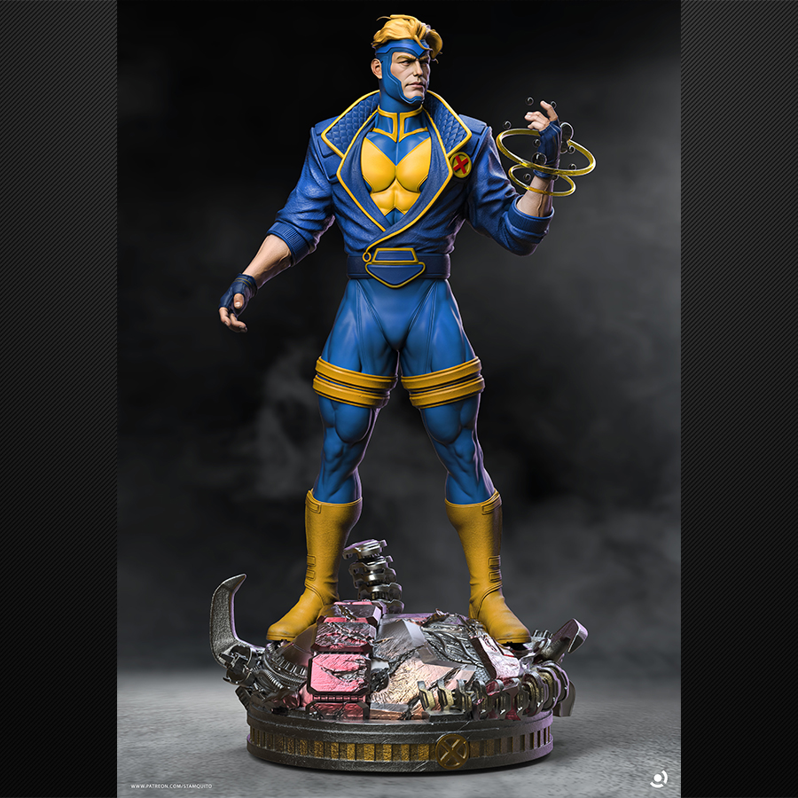 Havok brings that clean-and-classic mutant suit energy with a killer “power-up” pose—perfect for bold color blocking, crisp edge highlights, and smooth gradients across the blues and yellows. The swirling energy rings add a fun VFX element for glow effects (OSL if you’re feeling spicy 😄), and the tech-debris base gives you a whole second paint project: metals, scratches, grime, and small color pops to make the figure stand out even more.