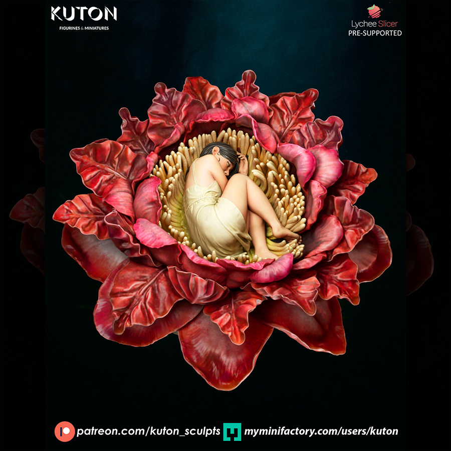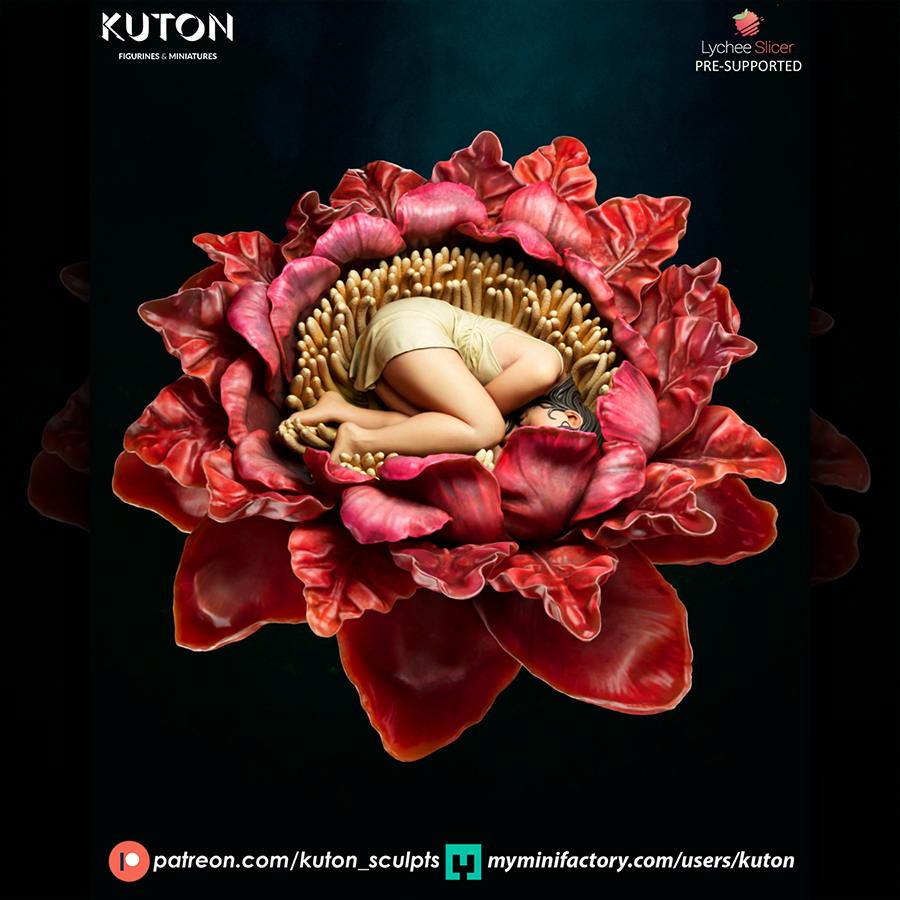 Himlay is pure “quiet fantasy” in sculpt form—one of those pieces that stops you mid-scroll because it feels like a tiny story frozen in time. The sleeping figure nestled inside a massive flower gives you a killer contrast of soft skin tones, delicate fabric, and big, dramatic petals that beg for rich blends, glazing, and subtle color shifts.