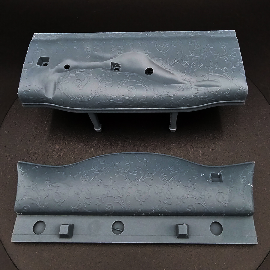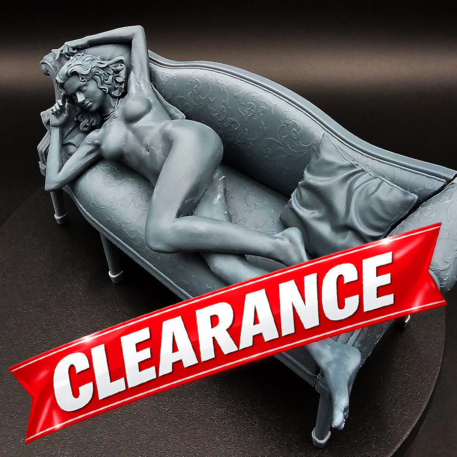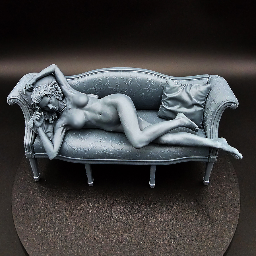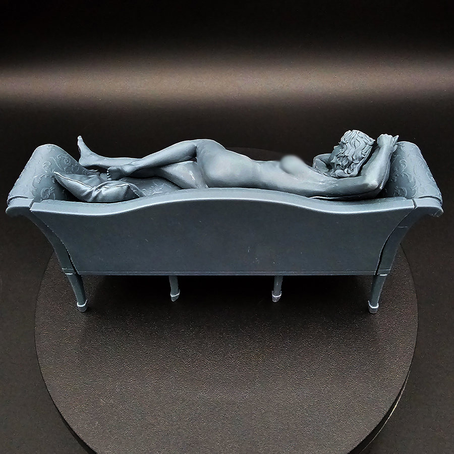This is a physical resin print supplied unpainted and unassembled. The kit is broken down into 8 parts total (figure, head, couch sections, and pillows) for straightforward assembly and finishing. Standard model prep is expected, including regular support mark cleanup, sanding, test fitting, priming, and painting.