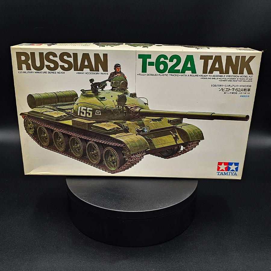 This is a Tamiya Russian T-62A tank kit in 1/35 scale. Parts are supplied unpainted and unassembled and will require standard model-building preparation such as cleanup, test fitting, and painting. The T-62A is a perfect subject for realistic armor tones, modulation, decals, washes, and pigment work, and it fits right into Cold War and modern-themed armor collections.
