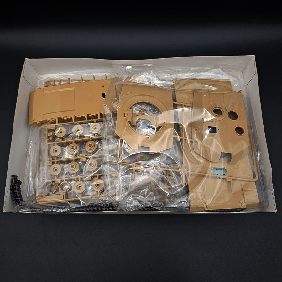 This is the Tamiya 1/35 scale U.S. M1A1 Abrams 120mm Gun main battle tank kit, number 35156. Parts are supplied unpainted and unassembled and will require standard model-building preparation such as cleanup, test fitting, and painting. This kit is partially opened, with some parts bags still sealed and some bags opened, making it a solid stash sale pickup for anyone ready to start an Abrams project without paying full retail.