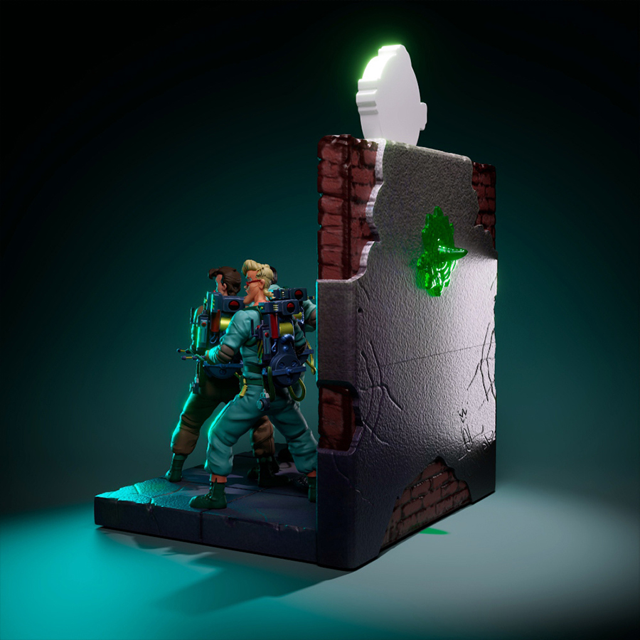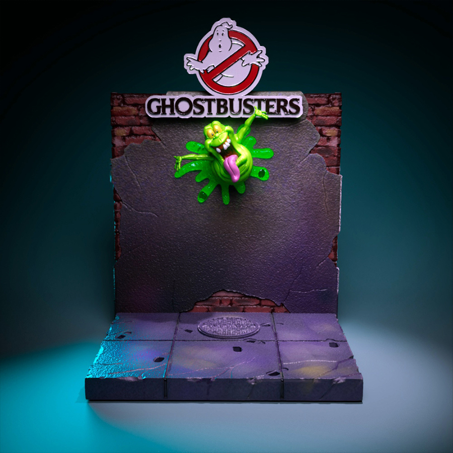 Bring classic Saturday-morning “ghost hunter team” energy to your shelf with this full diorama scene—four stylized figures, a big display base, and a wall-style backdrop topped with a logo sign, plus those iconic slime effects for maximum pop. Clean shapes, bold edges, and chunky, paint-friendly forms make this perfect for smooth color fills, crisp outlines, and subtle cel-shading, with lots of room for glossy goo and weathered brickwork.