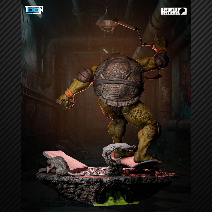 Bring the party turtle energy to your shelf with Michelangelo—caught mid-action in a gritty sewer scene, rocking that fearless grin like he’s about to turn the whole fight into a highlight reel. This stylized Toon Studios sculpt has bold shapes, clean lines, and tons of paint-friendly surfaces, so it’s perfect for bright orange accents, smooth comic-style blends, and just the right amount of grime on the base.