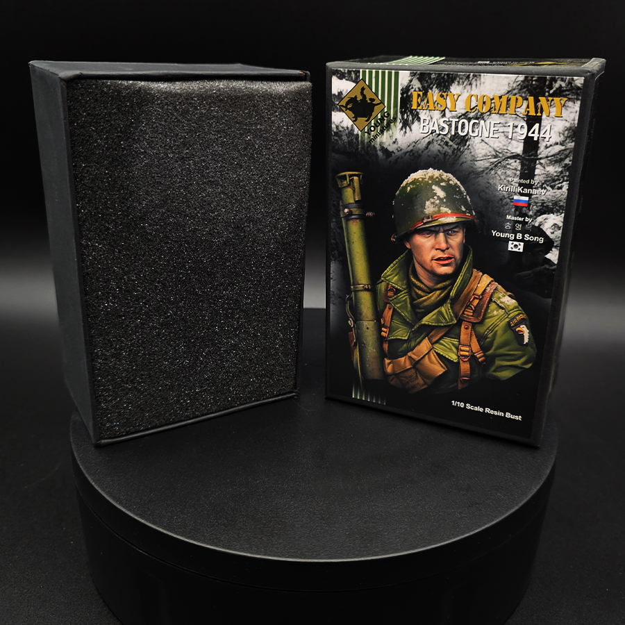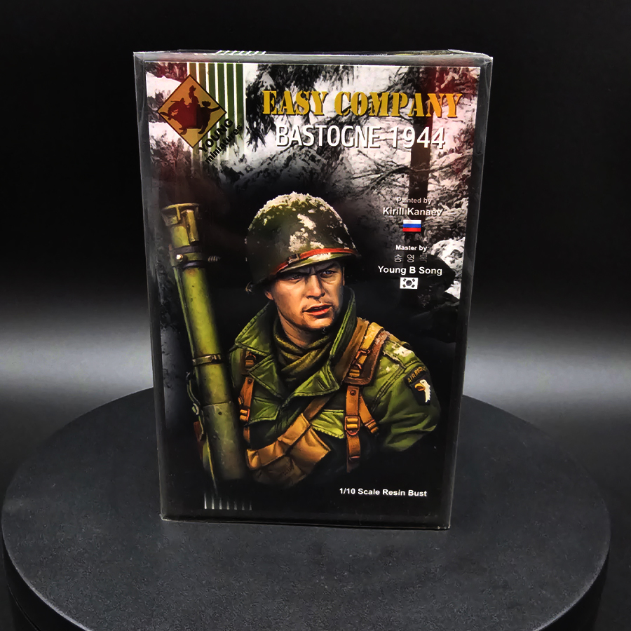 This is a 1/10 scale resin figure kit from Young Miniatures featuring an Easy Company subject set in Bastogne, 1944 (YM1855). It’s an excellent choice for WWII modelers and figure painters looking for a centerpiece paint project with crisp detail and strong historical theme.